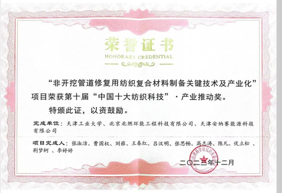 在此次大会中我公司与天津工业大学、北京北燃环能工程科技有限公司共同获得非开挖管道修复用纺织复合材料制备关键技术及产业化”项目荣获第十届“中国十大纺织科技”产业推动奖。